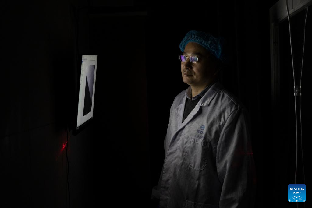 Researcher Zhao Miao observes experiment materials at a laboratory in the Shanghai Institute of Optics and Fine Mechanics, Chinese Academy of Sciences in east China's Shanghai, Feb. 29, 2024. (Xinhua/Jin Liwang)