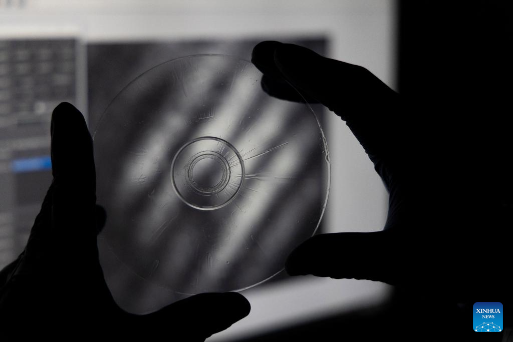 Researcher Zhao Miao shows a three-dimensional nanoscale optical disk memory with petabit capacity at a laboratory in the Shanghai Institute of Optics and Fine Mechanics, Chinese Academy of Sciences in east China's Shanghai, Feb. 29, 2024. (Xinhua/Fang Zhe)