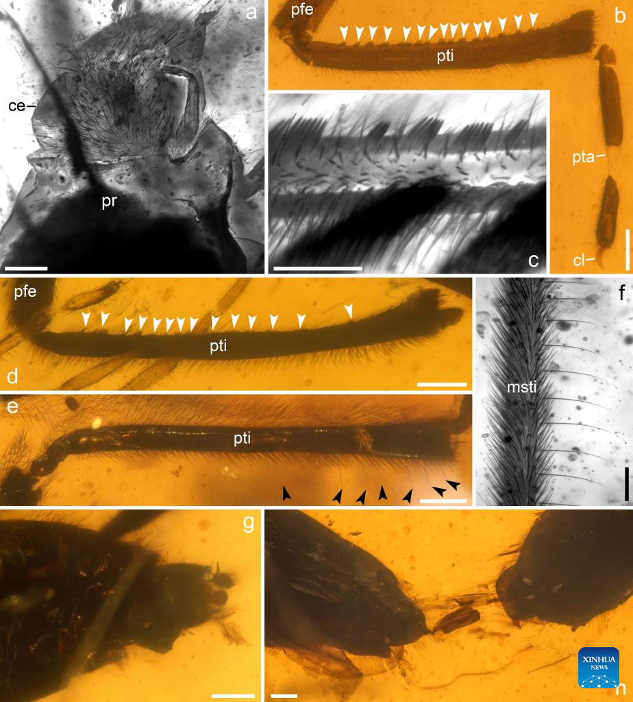 This combo photomicrograph provided by the Nanjing Institute of Geology and Palaeontology, Chinese Academy of Sciences (NIGPAS) shows details of water striders enclosed in amber. (NIGPAS/Handout via Xinhua)