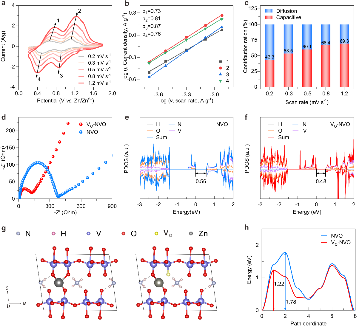 The generation of oxygen vacancies in the NVO lattice can accelerate the ion and charge transfer kinetics, reduce the diffusion barrier of zinc ions, and establish a stable crystal structure during zinc ion (de-intercalation). This defect engineering also facilitates the enhancement of the surface capacitive contribution of NVO due to the higher electrochemical surface reactivity and lower number of formation electrons required.