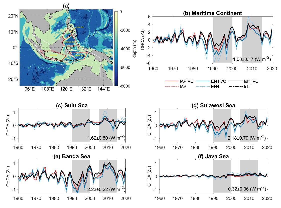 (a) Bathymetry of the Maritime Continent (MC) region; (b-f) Time series of Ocean Heat Content Anomalies (OHCAs) for the MC, Sulu Sea, Sulawesi Sea, Banda Sea, and Java Sea. (Image by IOCAS)