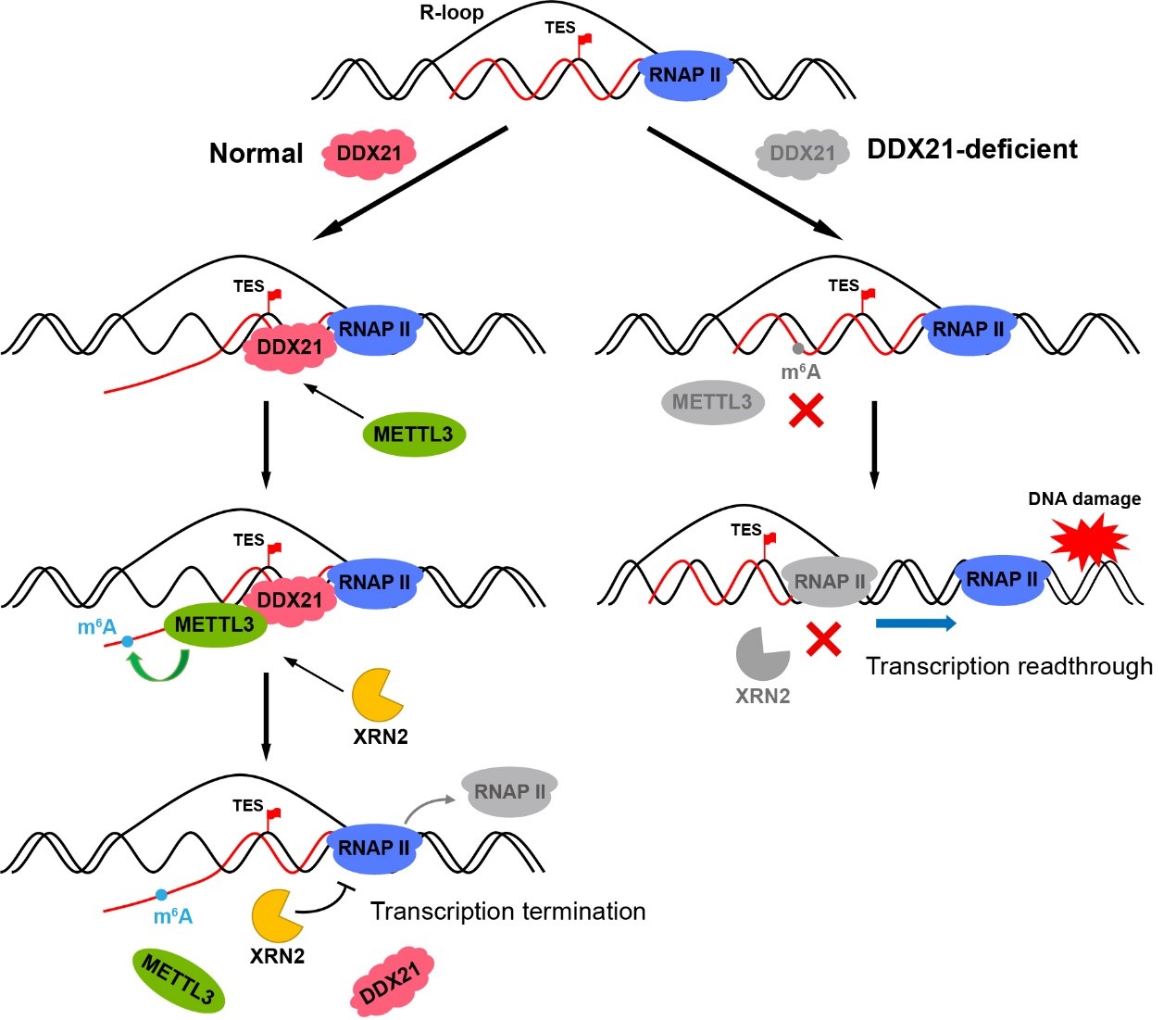 DDX21 mediates co-transcriptional RNA m6A modification to promote transcription termination and genome stability. (Image by REN Jie's group)