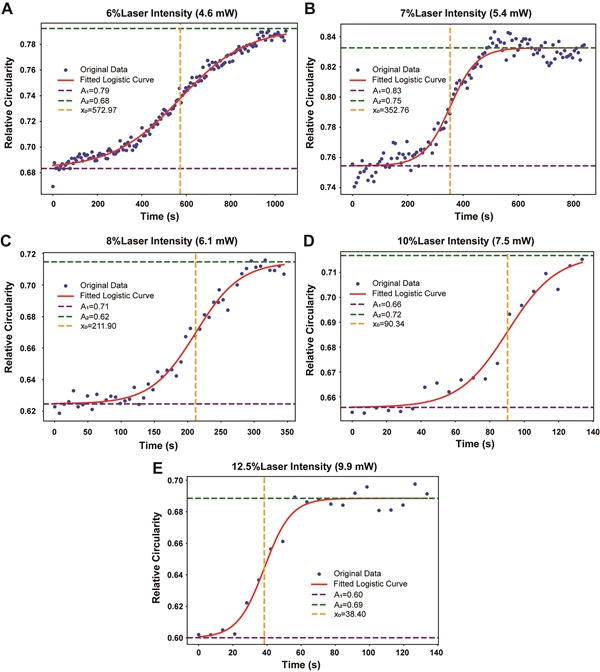 Typical dynamic profiles of cellular circularity in different groups with different PDT laser intensities. The data points, represented by blue dots, represent the observed experimental measurements of cell circularity at different time intervals. The orange curve represents the fitted logistic growth model superimposed on these data points. This model is characterized by an 'S-shaped' growth pattern: an initial slow growth phase, followed by a rapid exponential increase and a final plateau at a maximum limit. The results obtained under laser intensities of 4.6 mW, 5.4 mW, 6.1 mW, 7.5 mW, and 9.9 mW, respectively, are as follows: A-E. (Image by IGDB)