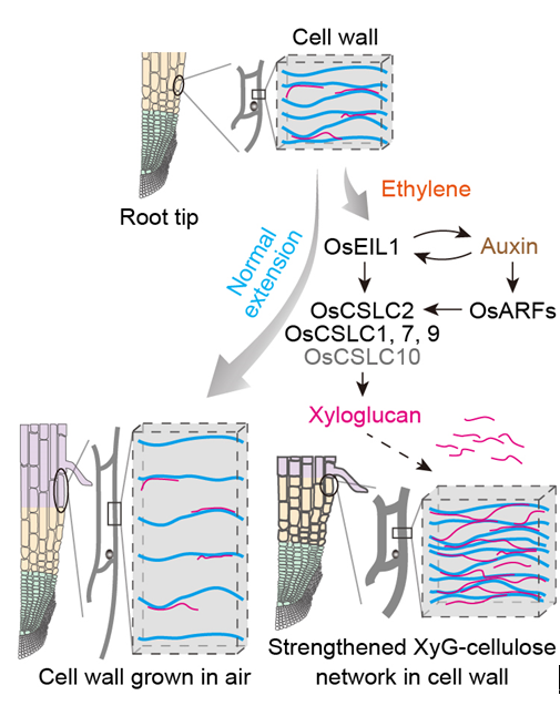 Researchers led by Prof. ZHANG Jinsong and Prof. ZHOU Yihua from the Institute of Genetics and Developmental Biology (IGDB) of the Chinese Academy of Sciences have shown that ethylene inhibition of root growth depends on CELLULOSE SYNTHASE-LIKE C proteins-mediated xyloglucan (XyG) induction in the cell wall of rice.
