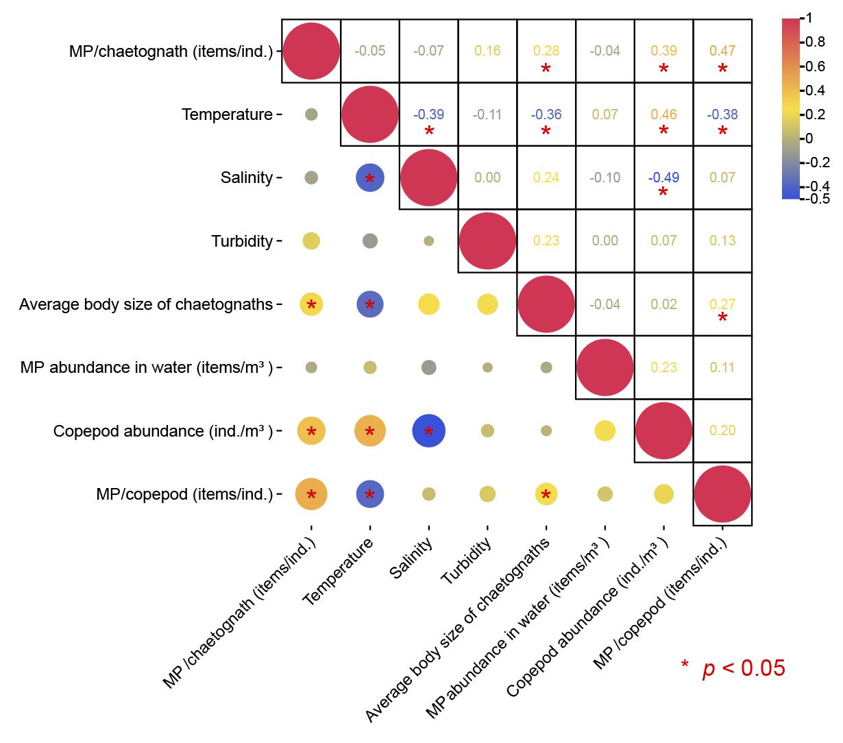 Fig. 2 Correlation analysis of the number of microplastics in chaetognaths with marine environmental factors, copepod abundance and the number of microplastics in copepods (Image by SUN Xiaoxia's group)