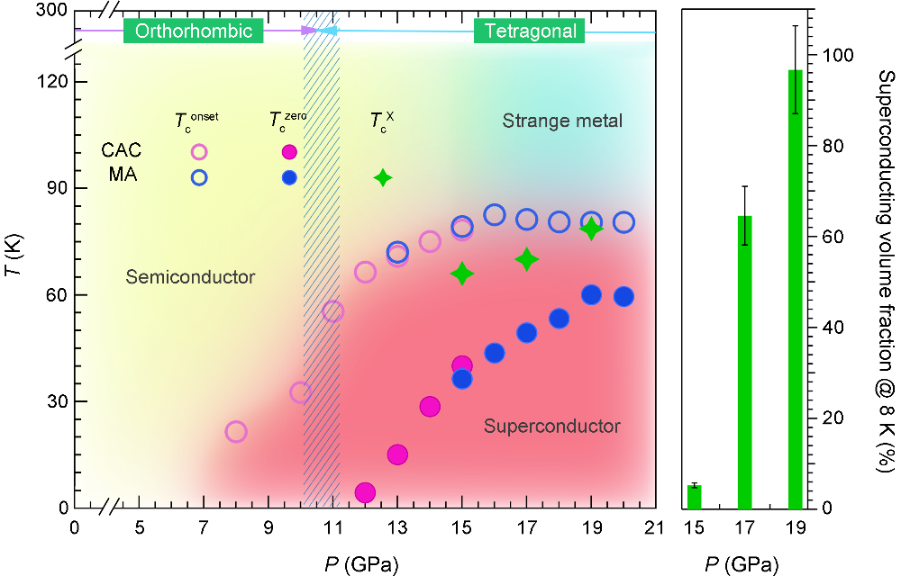 This sample underwent a pressure-induced structural transition from orthorhombic Amam to tetragonal I4/mmm at Pc ≈ 11GPa (Fig. 2). Their combined resistivity and ac magnetic susceptibility measurements under hydrostatic pressures provided the key evidence of bulk HTSC, including the zero resistance with high Tconset = 82.5K and Tczero = 60K, and the clear diamagnetic response with a superconducting shielding volume fraction of 97% (Figs. 3, 4).