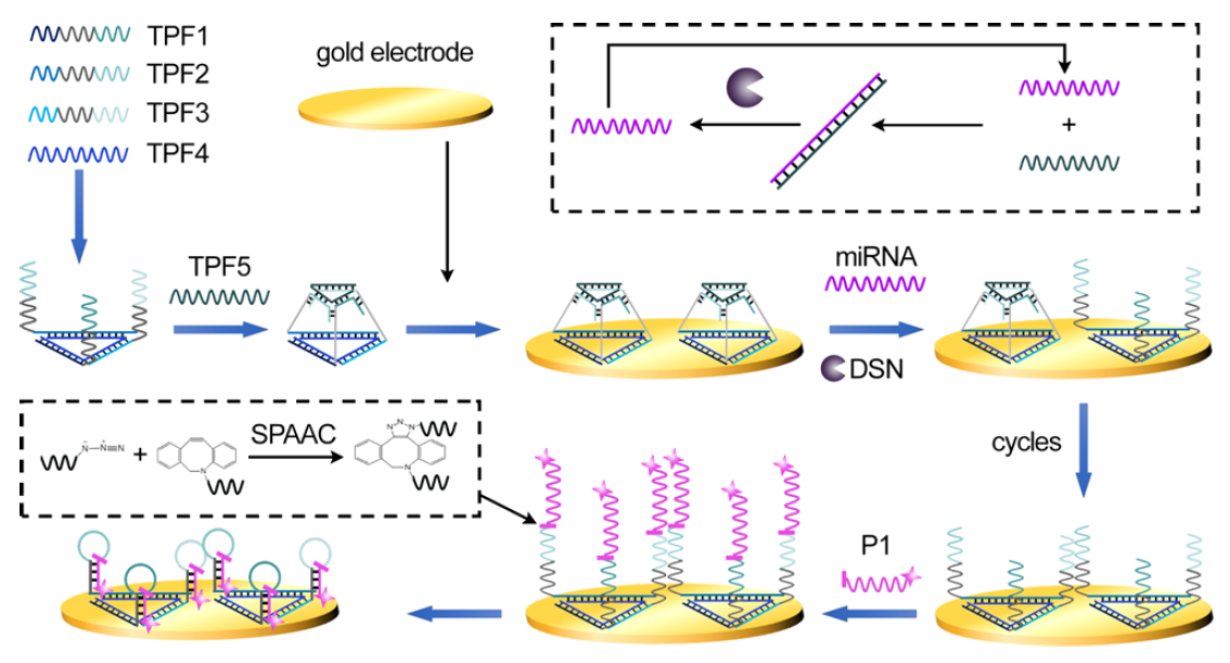 In the presence of target miRNA, duplex-specific nuclease (DSN) is utilized to digest the single-stranded DNA at the top of the DNA TPF, which can lead to the recovery of a DNA triangle and then benefit the following SPAAC ligation to locate multiple signal strands.