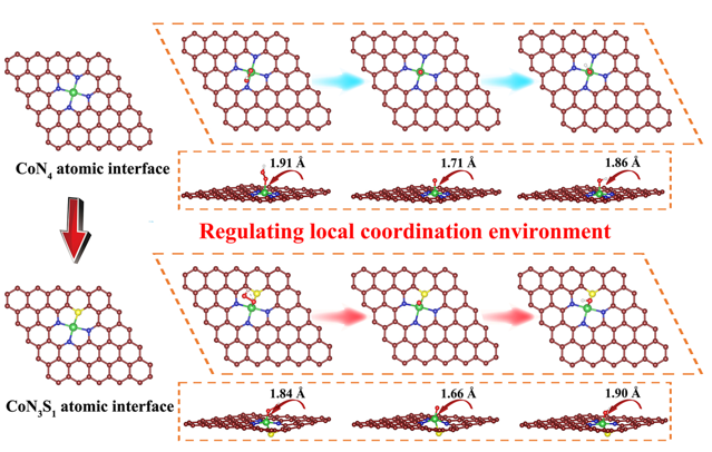 The DFT-optimized atomic configurations of oxygen intermediates (OOH*, O*, and OH*) adsorbed on symmetric CoN4 and asymmetric CoN3S1 atomic interface models (Image by ZHANG Canhui)
