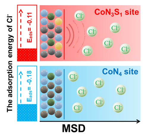 The schematic diagram of the asymmetric CoN3S1 model is more resistant to Cl- corrosion than the symmetric CoN4 model (Image by ZHANG Canhui)