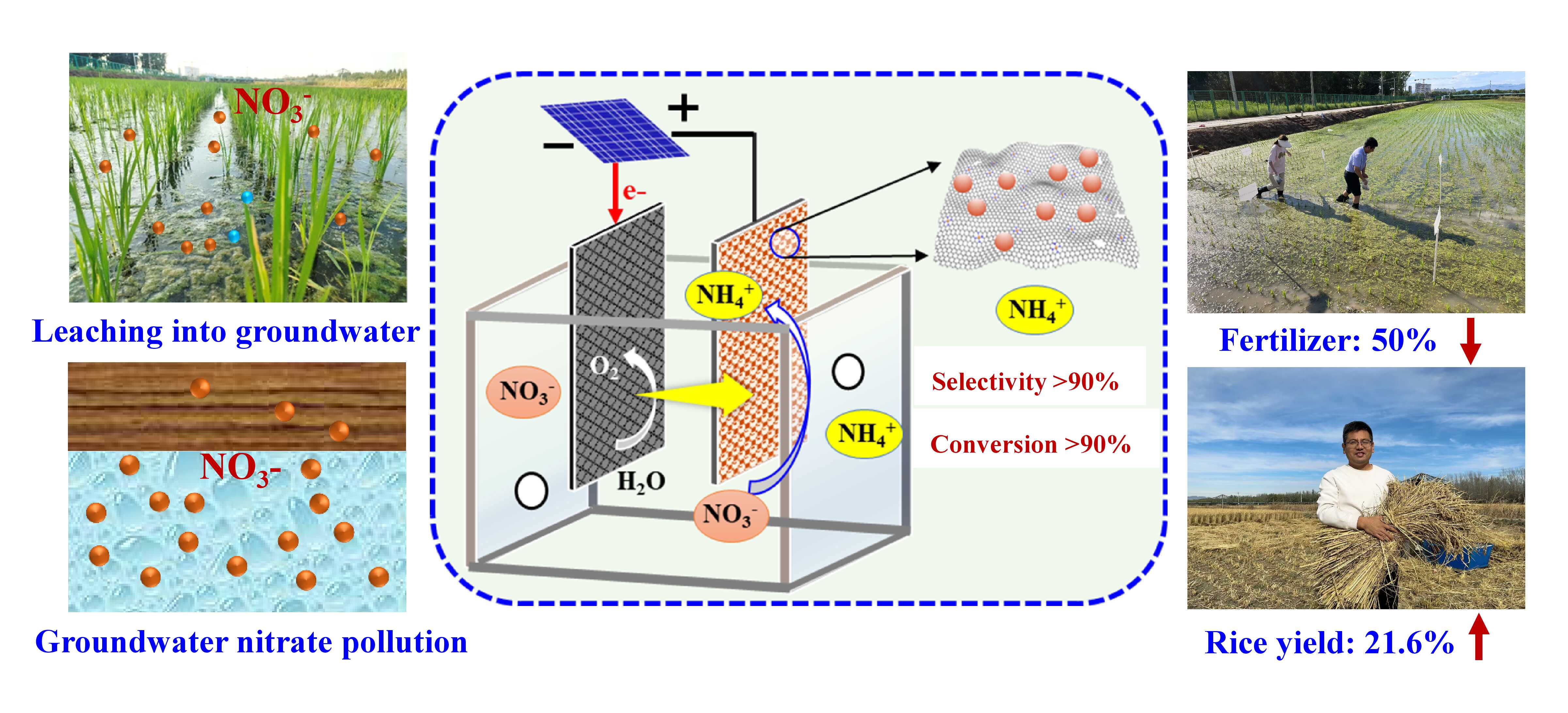 Researchers from the Research Center for Eco-Environmental Sciences (RCEES) of the Chinese Academy of Sciences have developed a sustainable technology to selectively reduce nitrate to ammonium. This innovation delivers three benefits: It increases rice yield, reduces fertilizer usage, and mitigates nitrate pollution in groundwater. The findings were recently published in Proceedings of the National Academy of Sciences (PNAS).