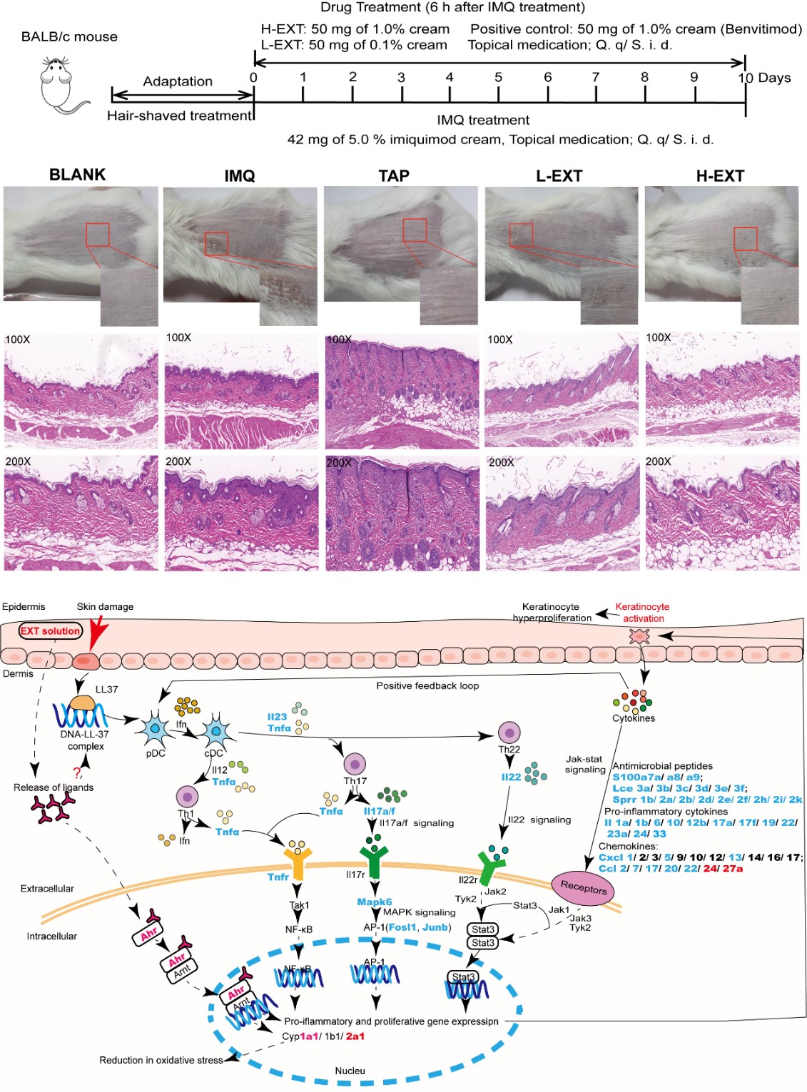 Using transcriptomic and proteomic analysis, the researchers found significant downregulation of several chemokines (Ccl2, Ccl20, and Cxc5, etc.), pro-inflammatory cytokines (such as Il17a, Il19, Il22, and Il23, etc.), and genes associated with keratinocyte differentiation (such as Lce and Sprr family genes). They concluded that the aryl hydrocarbon receptor (AhR) and genes of the cytochrome P450 family are activated by EXT.