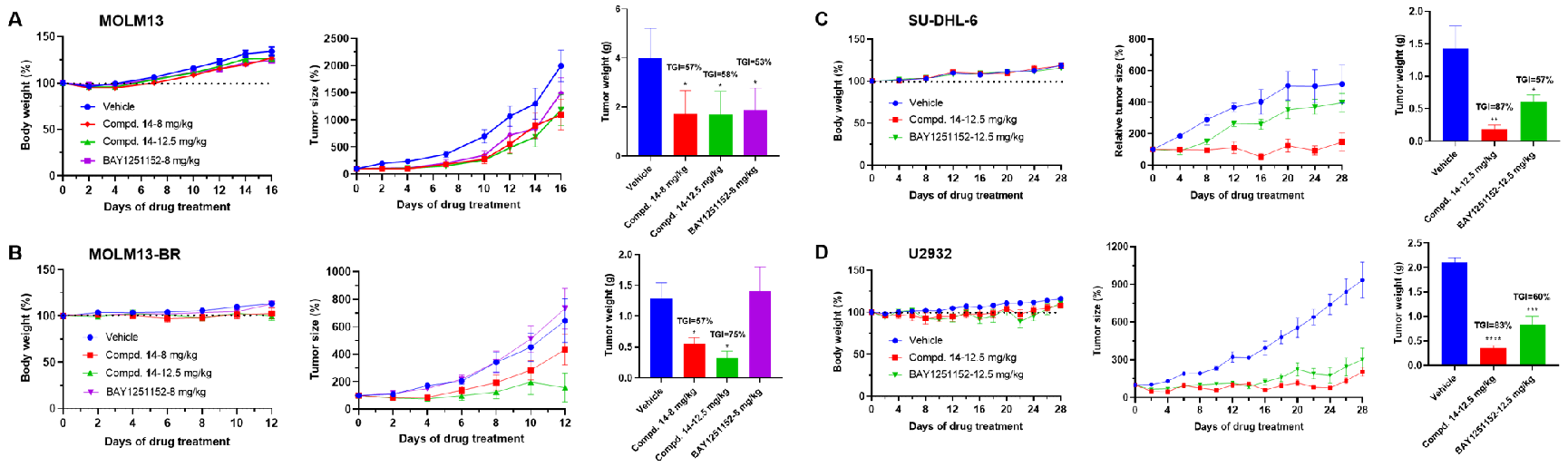 In vivo pharmacodynamic studies further confirmed the compound's strong antitumor efficacy in mouse models bearing hematologic malignancies with different genetic backgrounds.