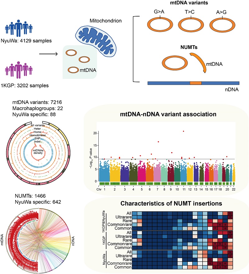 A research team led by Profs. XU Tao and HE Shunmin from the Institute of Biophysics of the Chinese Academy of Sciences conducted a comprehensive analysis of mitochondrial variants and nuclear mitochondrial DNA segments (NUMTs) from 7,331 individuals by integrating the NyuWa Genome Resource with data from the 1000 Genomes Project (1KGP).