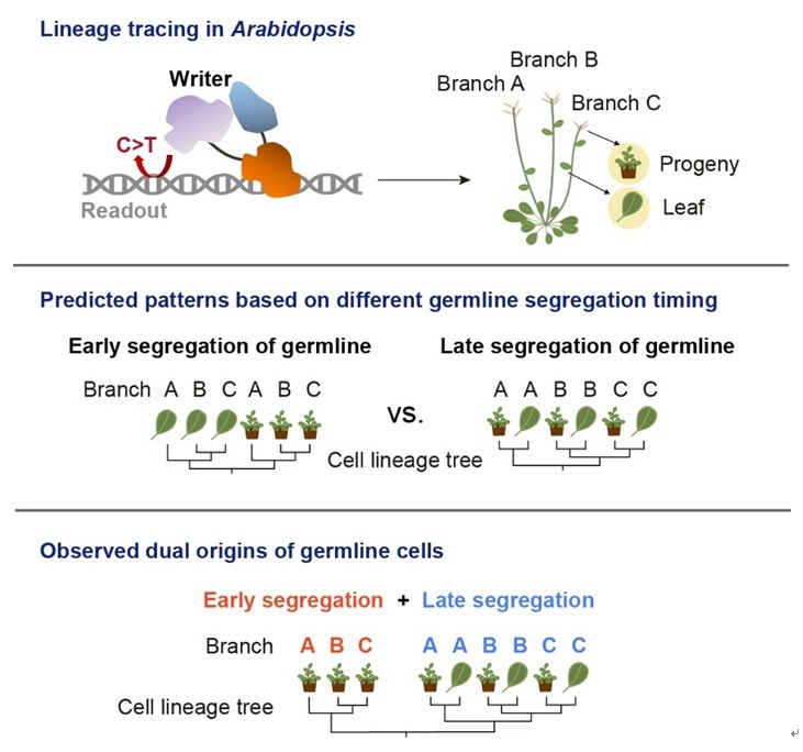 Based on the cell lineage tree, researchers discovered two distinct patterns of germline segregation in Arabidopsis: Some germline cells segregated during inflorescence meristem formation (late segregation), while others segregated earlier than branch formation (early segregation), providing support for a plant counterpart to Weismann’s germ plasm theory. By identifying this early segregation, the scientists determined that germline segregation in Arabidopsis occurred earlier than previously thought.