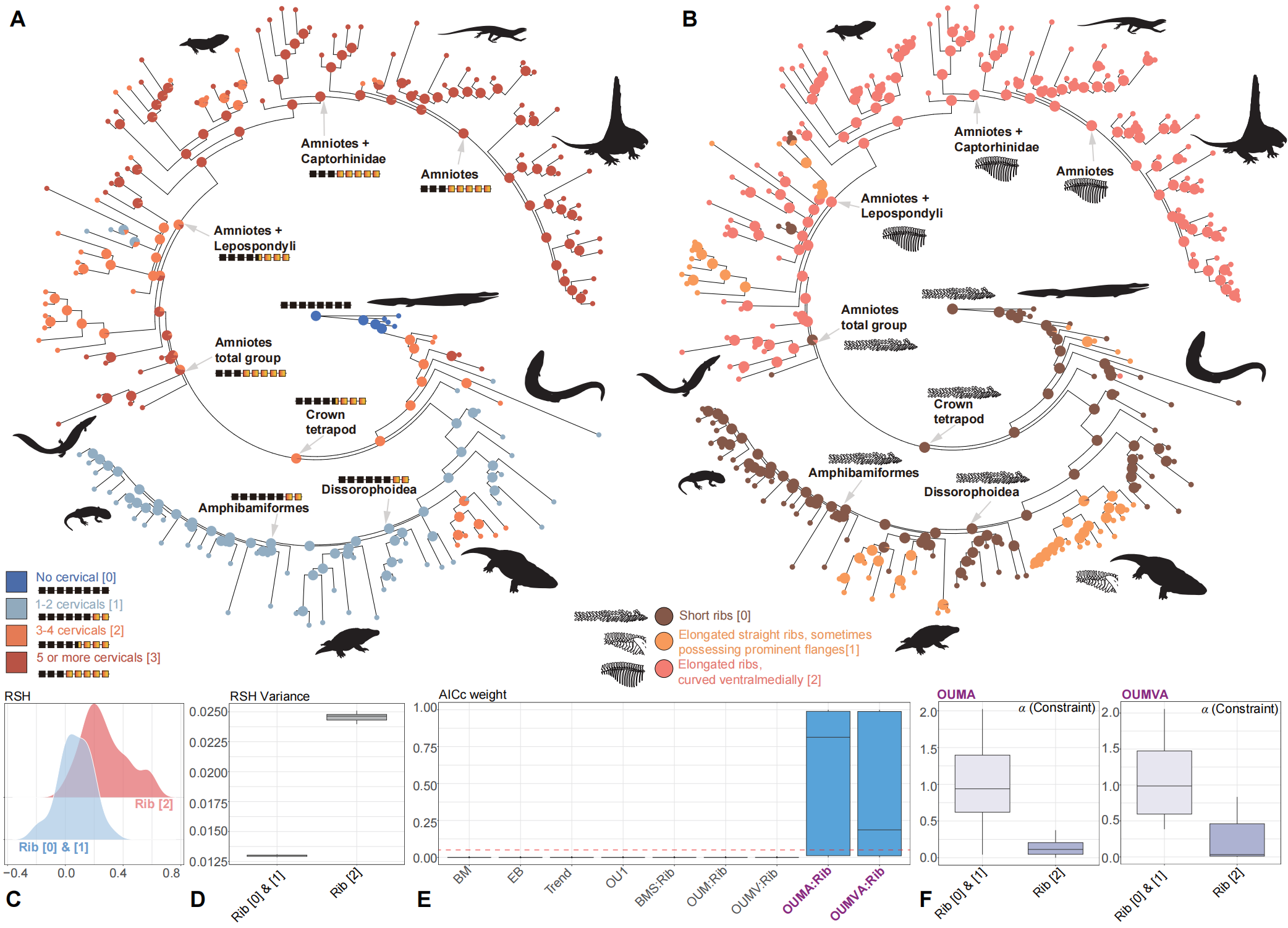 Evolution of cervical count and rib morphology across early-diverging tetrapods and the release of skull shape resulted from evolution of costal lung ventilation (based on Topology 1). (Image by YU Yilun et al.)
