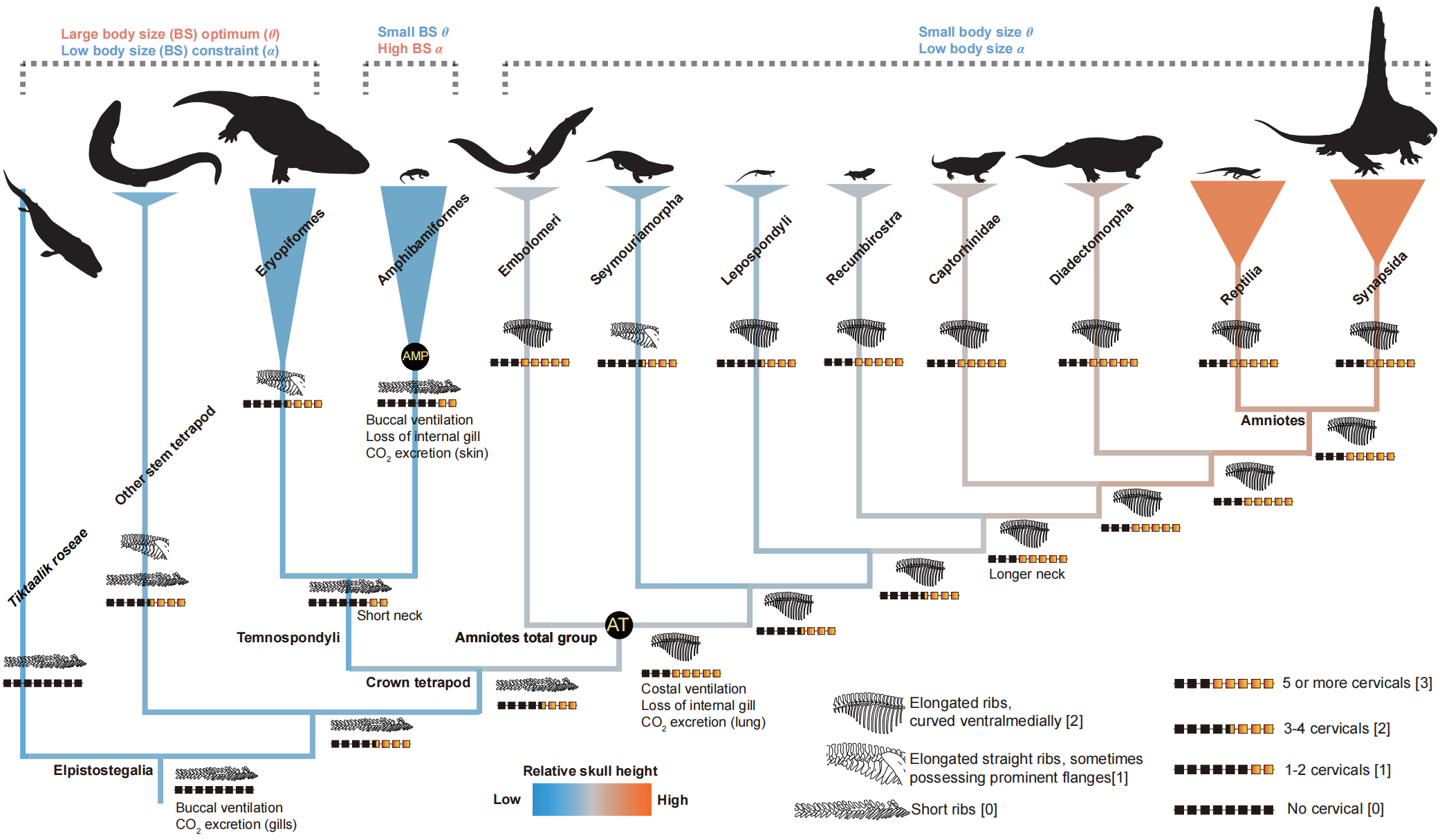 Key hypotheses of vertebrate terrestrialization propose a plausible link between body size evolution and the advent of costal lung ventilation during the deep divergence between amniote and lissamphibian antecedents. However, this long-standing hypothesis remained incompletely tested until recently.