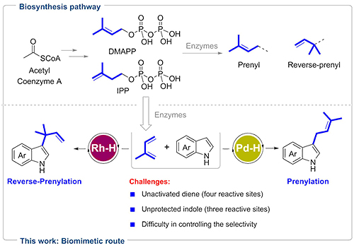 Biomimetic prenylation and reverse-prenylation of indoles with isoprene. (Image by HU Yancheng)