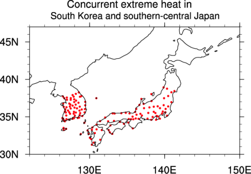 Global climate change has strongly increased the worldwide frequency of extreme heat in recent decades. South Korea and southern-central Japan are also frequently affected by extreme heat, and the extreme heat in these two regions tend to occur simultaneously.