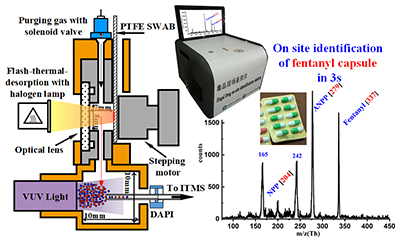 Schematic diagram of the synchronized flash-thermal-desorption purging and ion injection and the on-site identification of fentanyl capsule. (Image by WANG Weimin)
