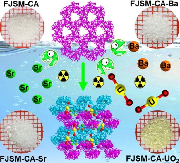 The advantages of FJSM-CA as ion-exchange material include rapid kinetics, high exchange capacity and high selectivity. FJSM-CA exhibits fast adsorption abilities with short equilibrium times for Sr2+ (2 min), Ba2+ (10 min), and [UO2]2+ (20 min). It has high adsorption capacity for uranium (qmU = 121.91 mg/g) than those of a series of MOFs including SZ-2/SZ-3 (58.18 mg/g), UiO-66 (109.9 mg/g), and MIL-101-NH2 (90 mg/g). It also shows high removal rate R (96%) and distribution coefficient KdU (2.46 × 104 mL/g) for uranium in the presence of Sr2 and Ba2+ ions.