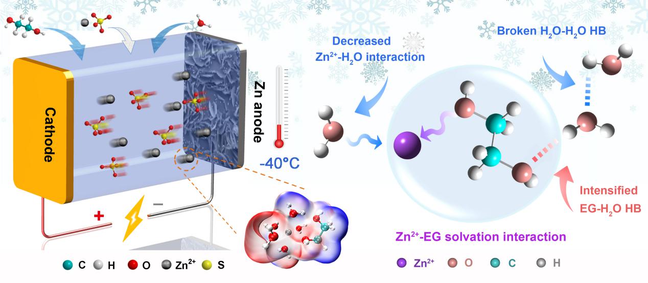 Schematic illustration of the ZBBs with hybrid electrolytes at low temperatures and possible mechanism of how Zn2+-EG solvation interaction impacts the chemistry of the hybrid electrolyte (Image by CHANG Nana)