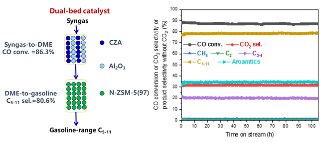 A research group led by Prof. LIU Zhongmin and Prof. ZHU Wenliang from the Dalian Institute of Chemical Physics (DICP) of the Chinese Academy of Sciences realized highly efficient and selective conversion of syngas to gasoline-range liquid hydrocarbons over a dual-bed catalyst.