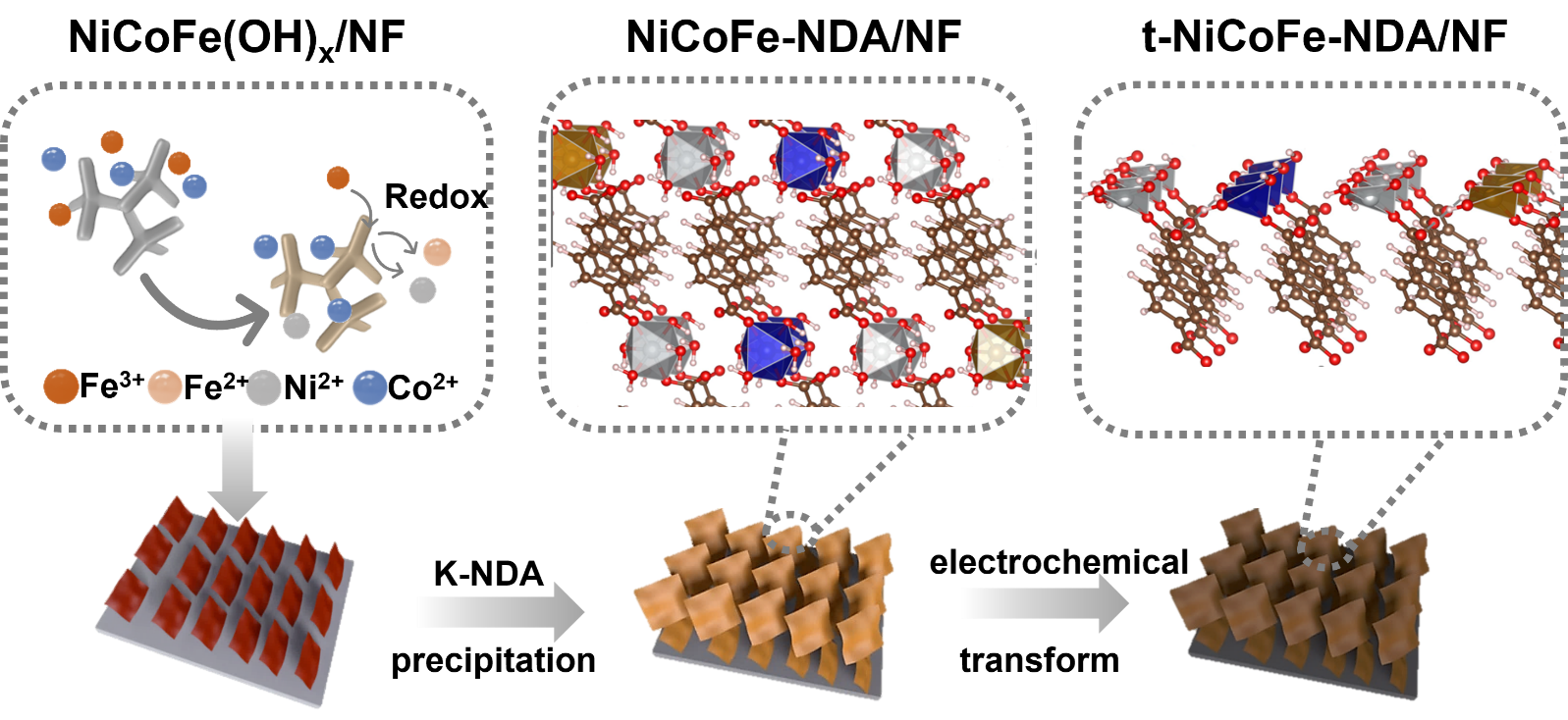 Schematic illustration of the formation and transform process of NiCoFe-NDA/NF. (Image by SICCAS)