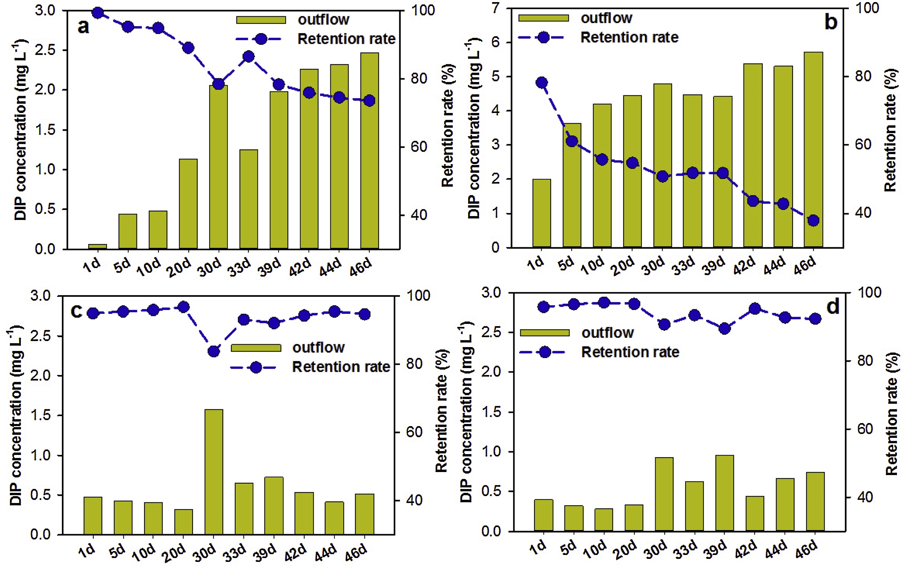 Fig.1 Variation in DIP concentration in the effluent and the removal rate of DIP using unamended-(a), NZ-(b), AMC-(c), and LaMB-amended(d) soils over time (Image by IGCAS)