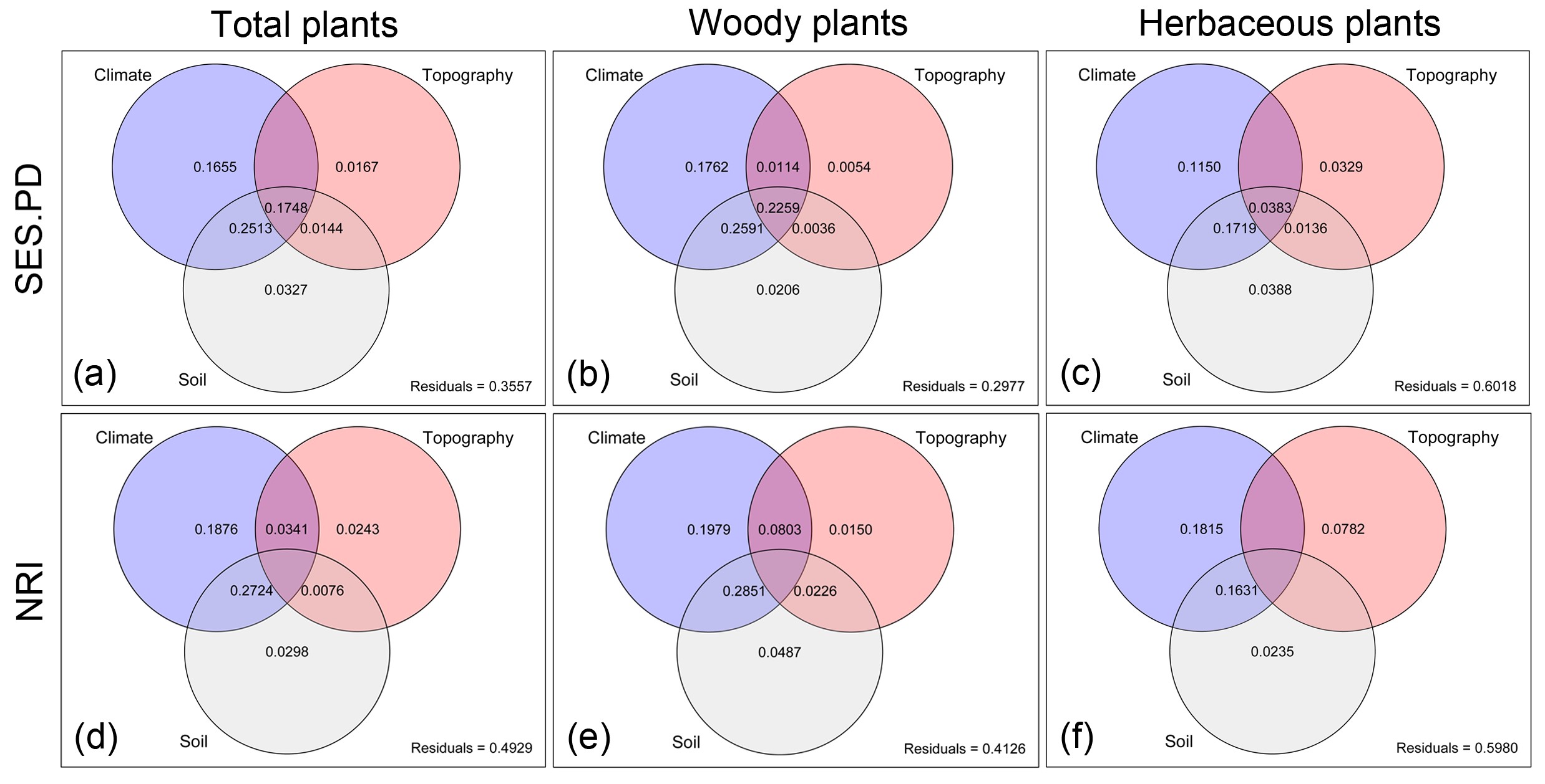 Variation partitioning of SES_PD and NRI values for total, woody and herbaceous plants into the independent effects of climate, topography and soil, as well as their overlaps (Image by ZHOU Yadong)