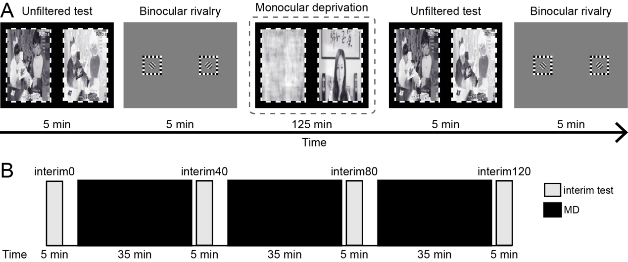 Before and after 2.5 hours of MD (Figure 1A) was an unfiltered SSVEP test where the stimuli in both eyes were identical unfiltered natural movies (though flickering at different frequencies). During the MD, the test stimuli were same as the adapter, allowing the researchers to track the neural changes over time (Figure 1B).