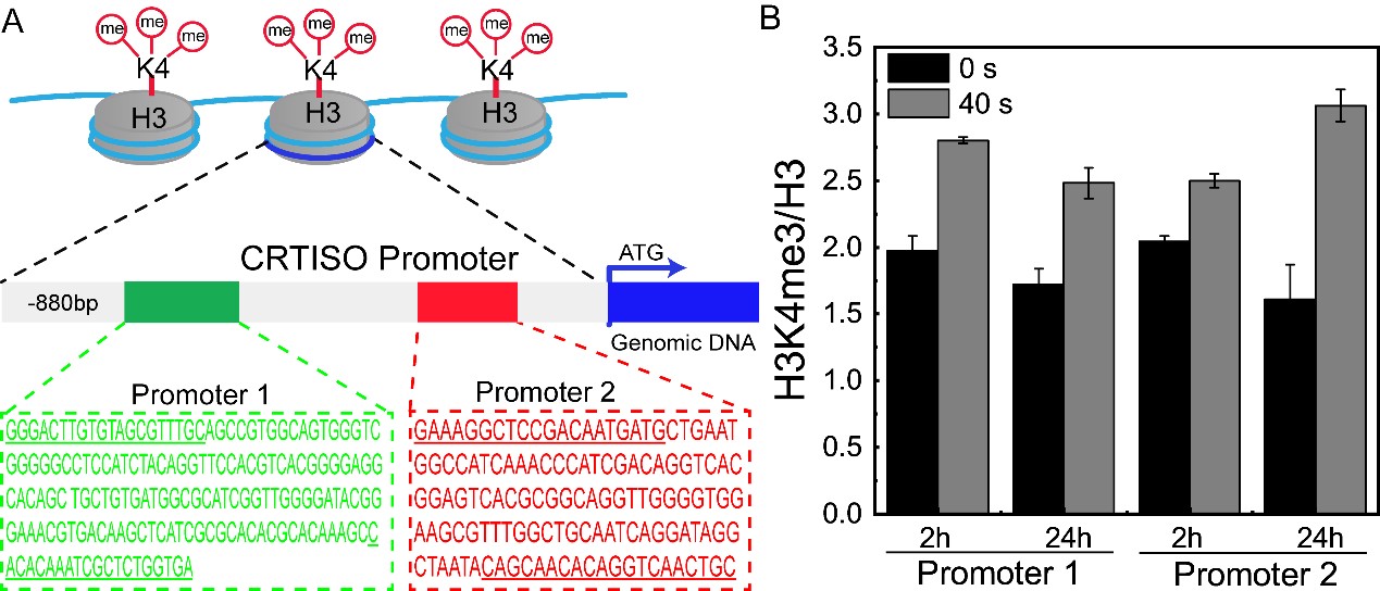 Through immunofluorescence experiment, they found that the fluorescence intensity of histone H3 lysine 4 trimethylation (H3K4me3) increased after plasma discharge treatment, indicating epigenetic changes. The chromatin immunoprecipitation-PCR experiment further confirmed that the site of h3k4me3 was located in the promoter region of CRTISO, and the promoter expression was up-regulated.