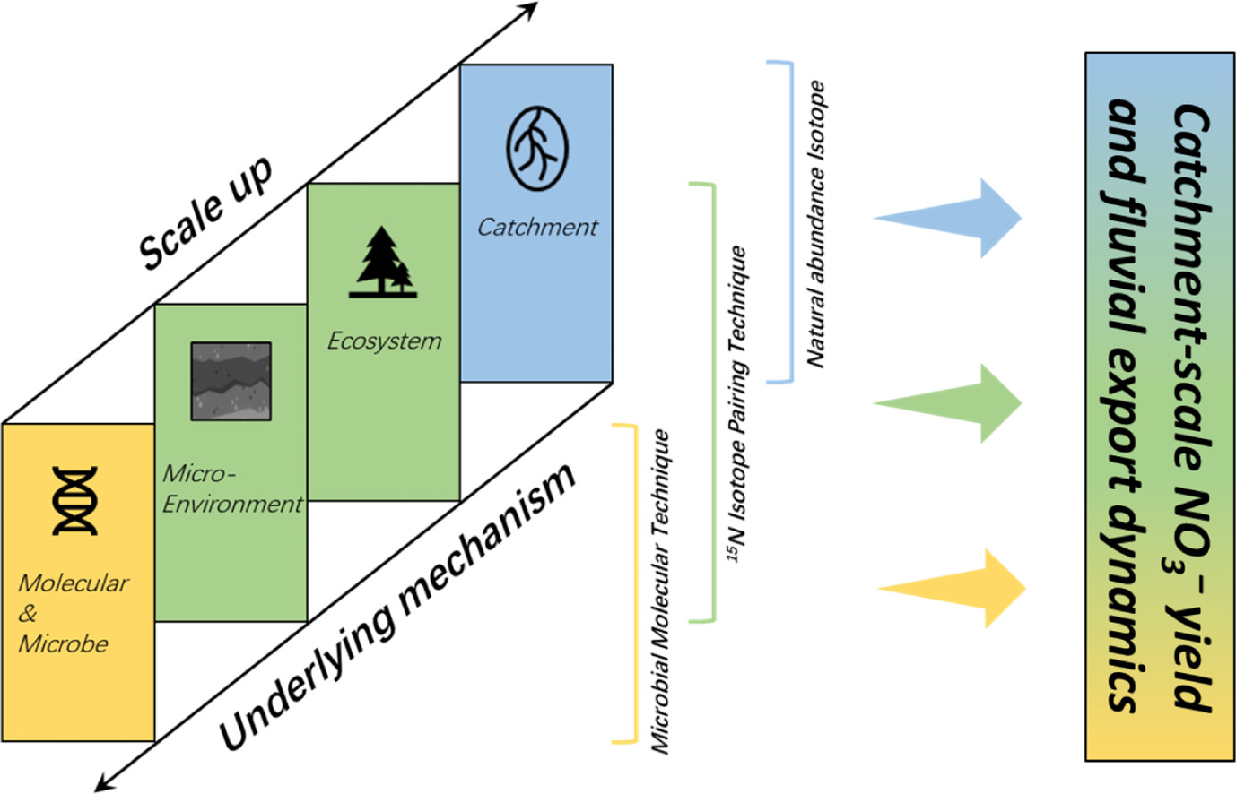 Historically, natural abundance isotopic compositions of NO3– (δ15N/δ18O-NO3–) in a river have been used to reveal catchment-scale NO3– sources and removal, and molecular techniques and 15N pairing experiments can quantify NO3– related processes and their regulators in microenvironments. However, there is a long-standing gap between these techniques because they focus on different aspects of a catchment.