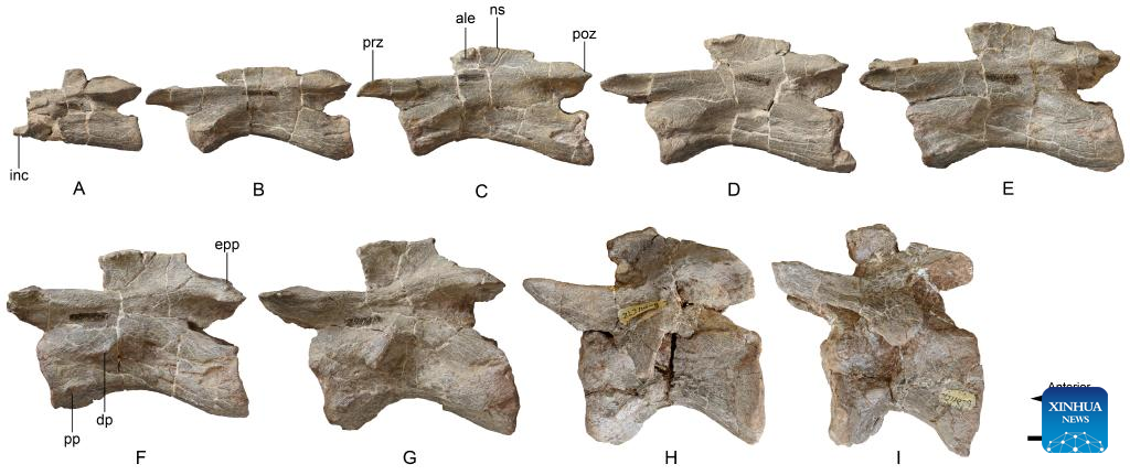 This image provided by the Institute of Vertebrate Paleontology and Paleoanthropology of the Chinese Academy of Sciences shows the left-side view of the cervical vertebrae bones sequence of Lishulong wangi. (Institute of Vertebrate Paleontology and Paleoanthropology of the Chinese Academy of Sciences/Handout via Xinhua)