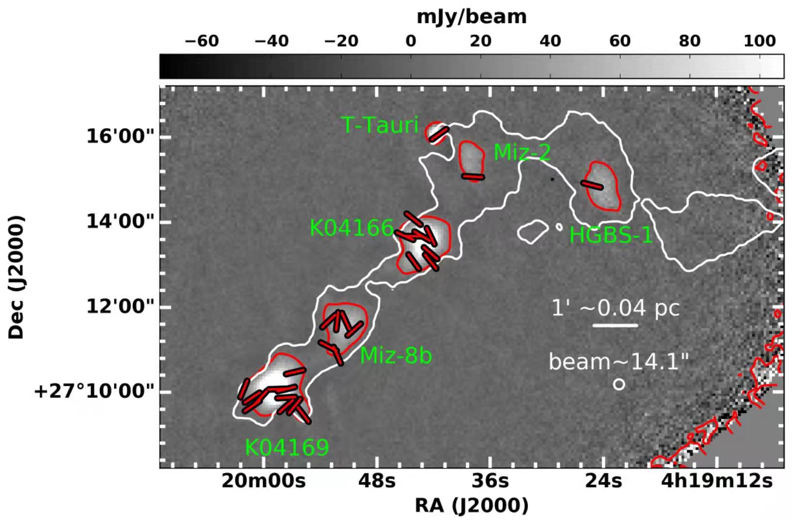 Fig. 1 Core-scale magnetic fields (red segments) inferred using high-resolution and sensitive dust emission polarization observations using JCMT. The Solar-type star forming cores fragmented out of B213 filament are shown. (Image by Eswaraiah Chakali, et al. 2021)