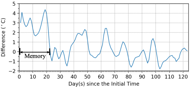The memories of the LST/SUBT initial anomalies (referred as surface/soil memories) are defined as the time interval between the time when the time series of difference in daily LST/SUBT between the ±5℃ and control experiment break through the zero value line and the initial time, with the unit of days. The memory of T2m anomaly (referred as T2m memory) is defined in the same way, as an index to assess the response of surface air temperature to the LST/SUBT initial anomalies.