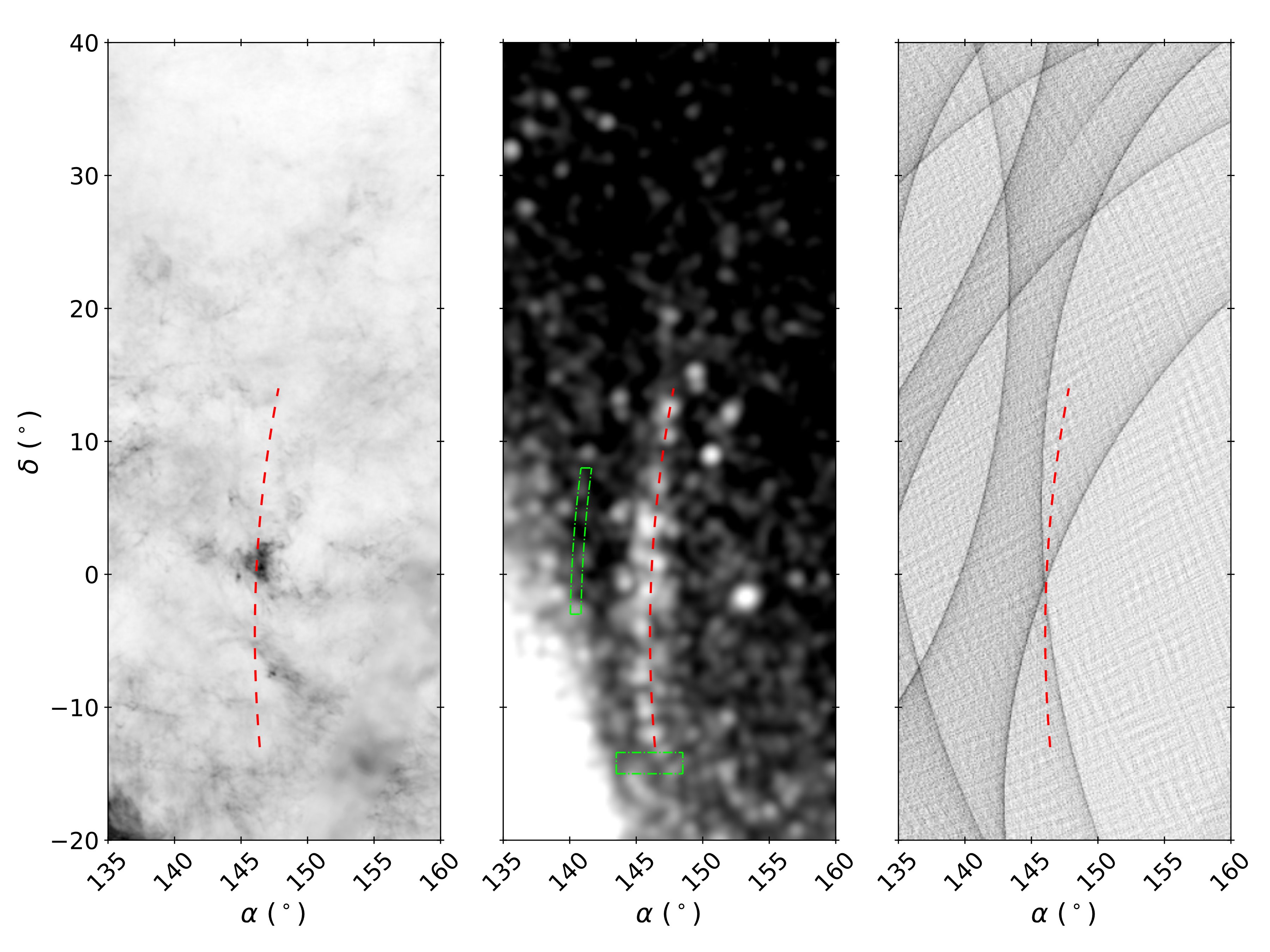 Fig. 2 The middle panel shows Yangtze location (red dashed line). The left and right ones show the interstellar extinction map and Gaia DR3 scanning pattern, respectively. (Image by YANG et al.)