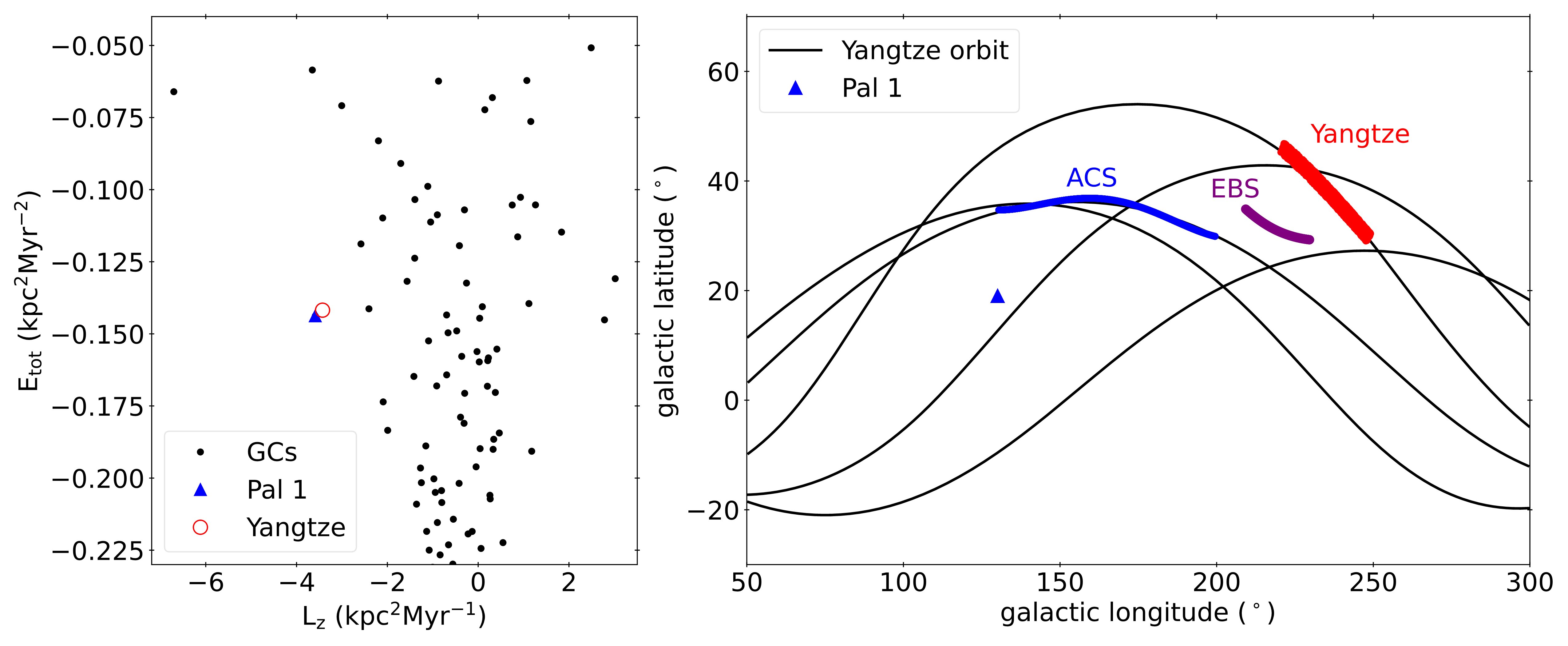 Fig. 3 Left: globular clusters and Yangtze in angular momentum and energy space; Right: the orbit of Yangtze and trajectories of known streams. (Image by YANG et al.)