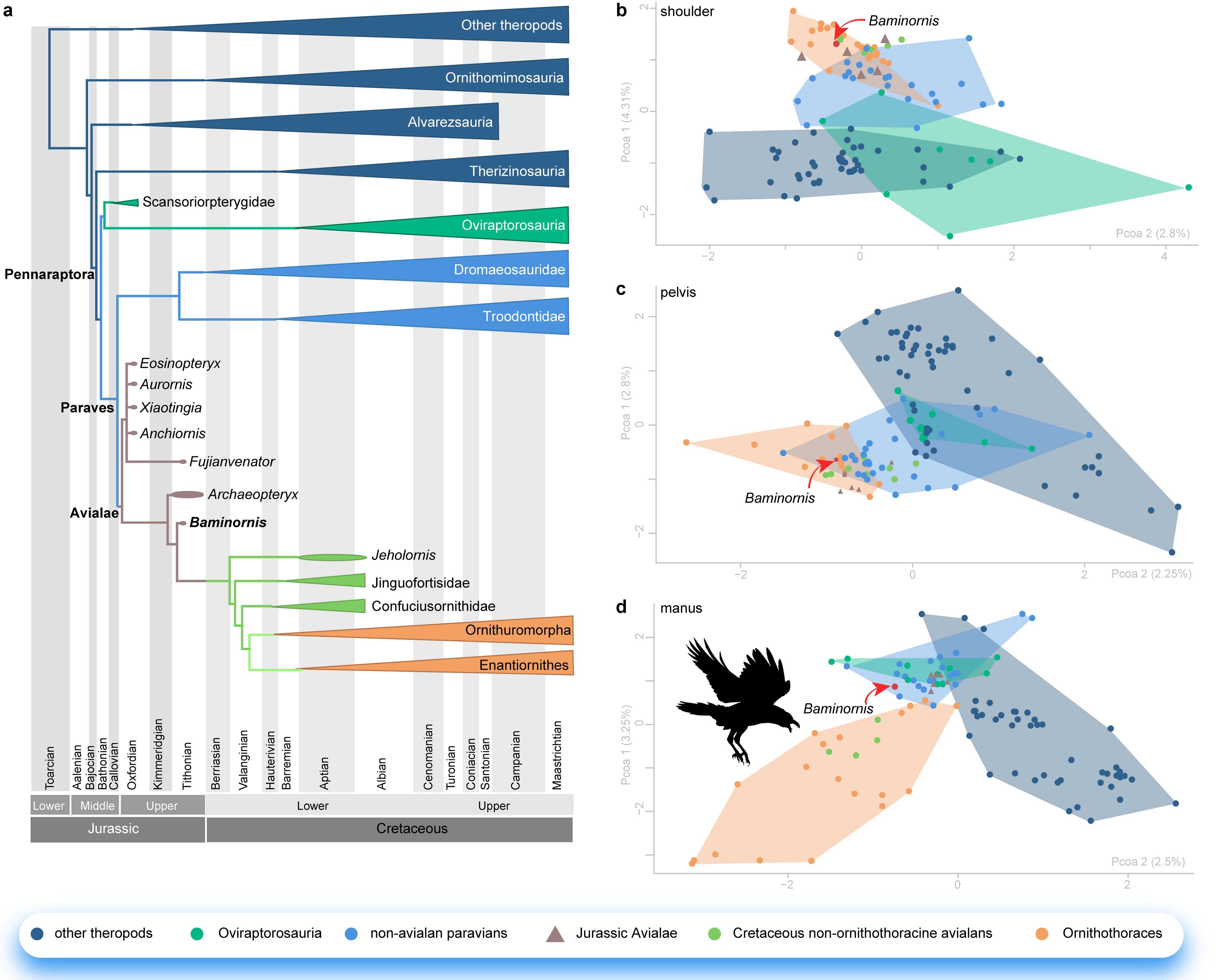 Figure 2. The evolutionary tree showing the position of Baminornis zhenghensis, and the morphometric space illustrating the modular evolution of different body parts (Image by WANG Min)